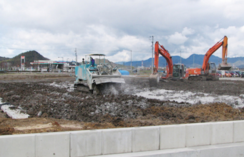改良材は1000kg必要となる。 - 3.対象土に対し算出した添加量の改良材を投入し、施工機械により撹拌混合する。